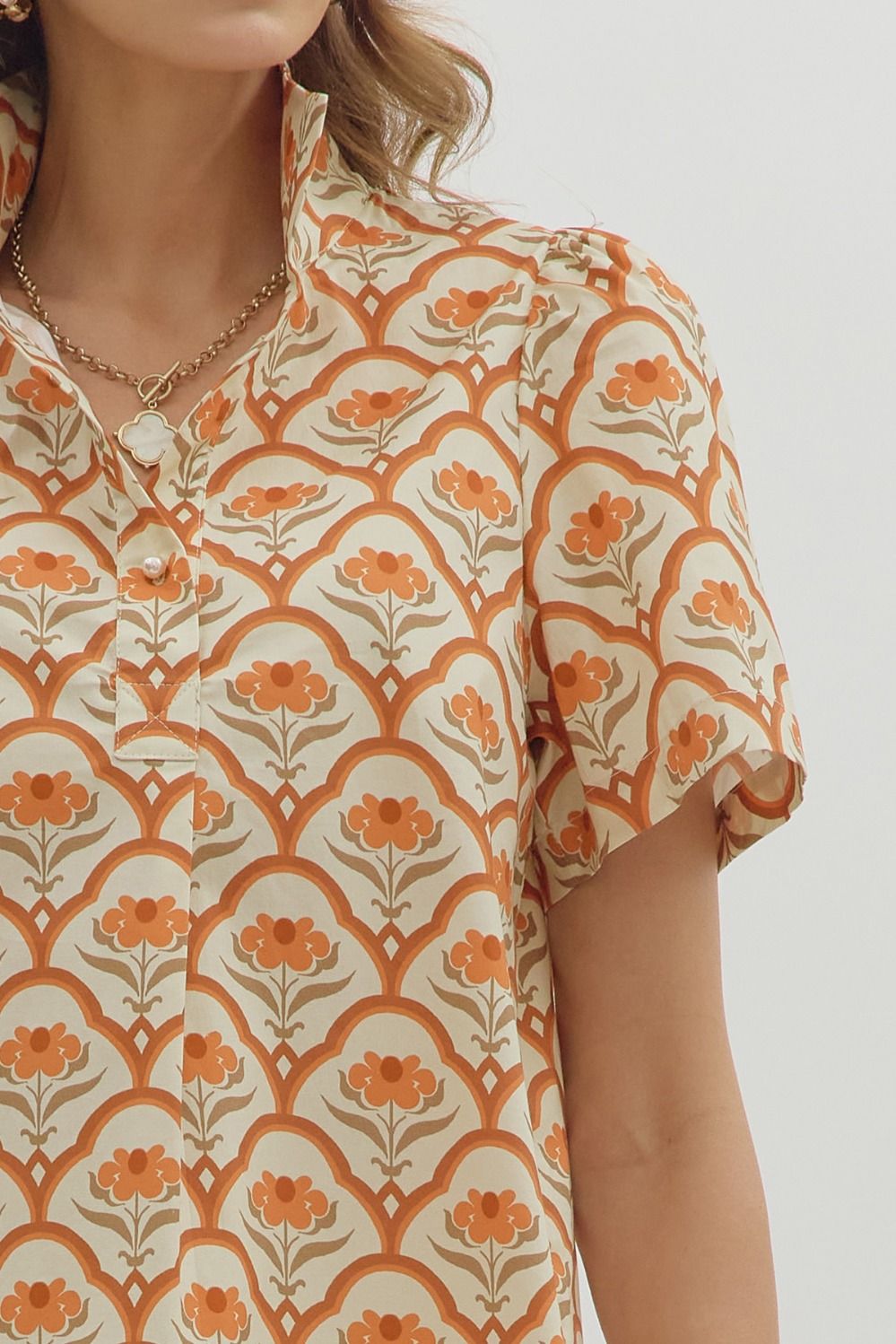 Floral pattern high neck puff shoulder short sleeve top featuring peach accent single button closure at front. Unlined. Woven. Non-sheer. Lightweight.