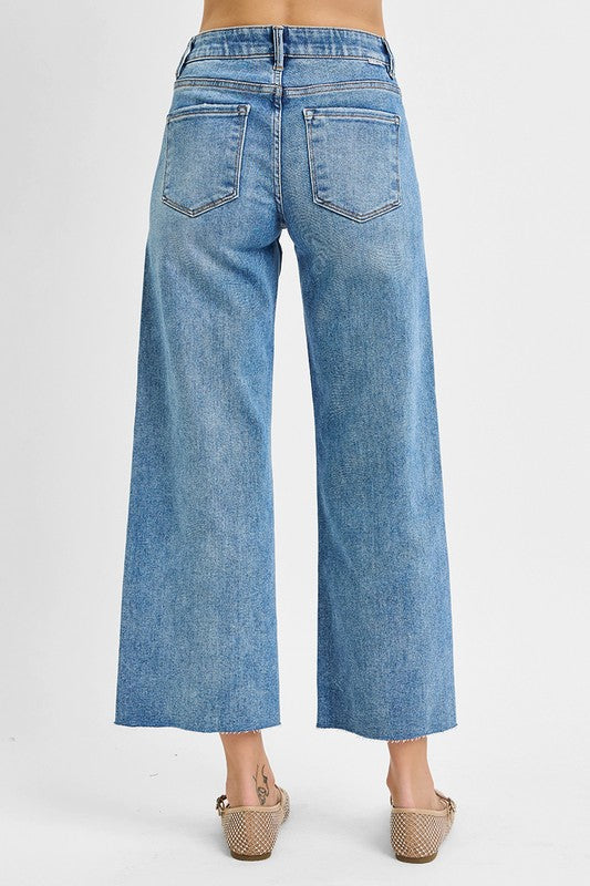 Light wash tummy control mid-rise wide leg crop with interior elastic waistband detail.