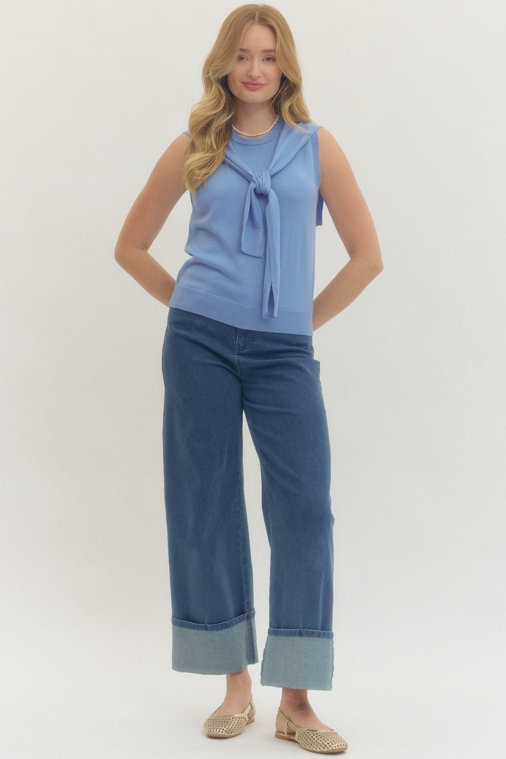 Solid sleeveless knit top featuring self-tie scarf accent at neckline creating a layered draped effect. Ribbed neckline, armholes, and hem. Unlined. Knit. Non-sheer. Lightweight.