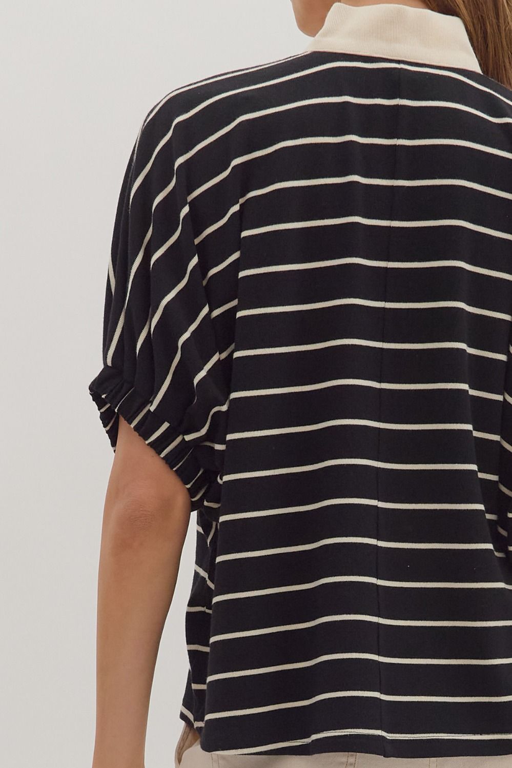 Striped short dolman sleeve top featuring contrast trim split V-neck. Elasticated sleeve opening. Unlined. Knit. Non-sheer. Lightweight.