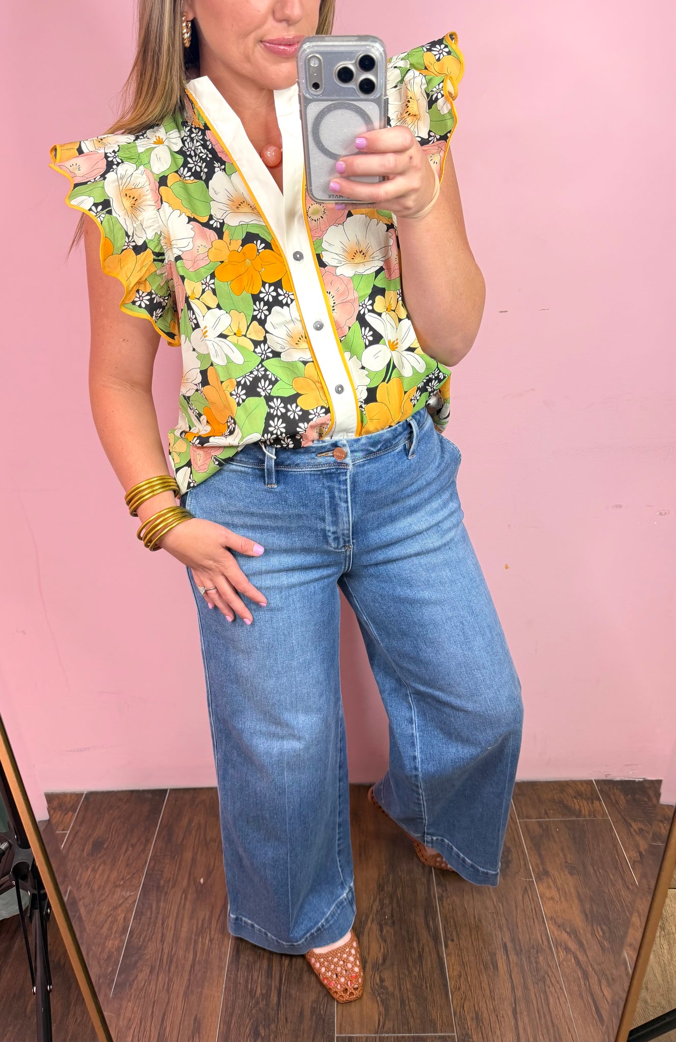 Marigold florals with button down detail & flutter sleeves.