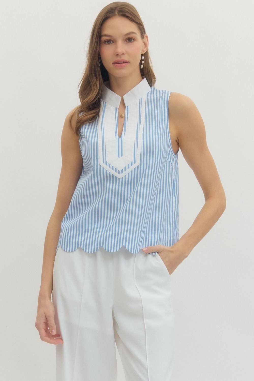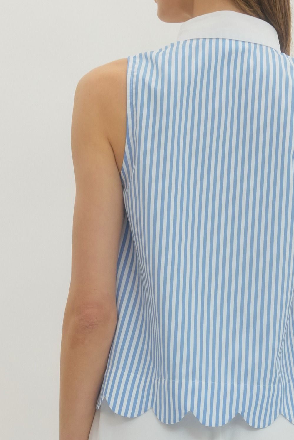 Striped sleeveless top featuring contrast trim V-neck placket. Scallop hem. Unlined. Woven. Non-sheer. Lightweight.