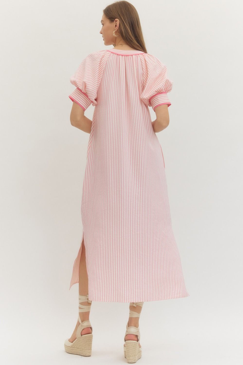 Stripe short sleeve midi dress featuring floral embroidery at front and band collar with V-cut neckline. Pocket at side. Unlined. Woven. Non-sheer. Lightweight.