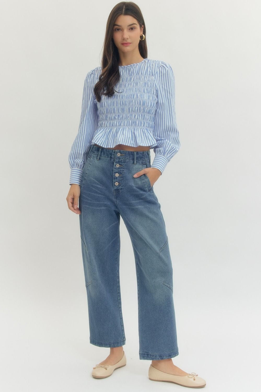 Striped long sleeve top featuring full smocking at body and flounce hem. Button closure at back neck. Button closure at cuff. Unlined. Woven. Non-sheer. Lightweight.